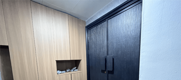 入户门安装的是梵蒂斯铝木装甲双开门,高2.4m,宽1.6m,大气庄重;楼梯间通铺瓷砖。