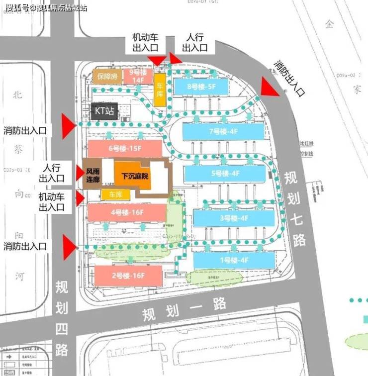 多个消防出入口的合理布局,有效减少了因消防回车场地设置而造成的硬地面积过多问题,最大限度地增加了绿化面积。