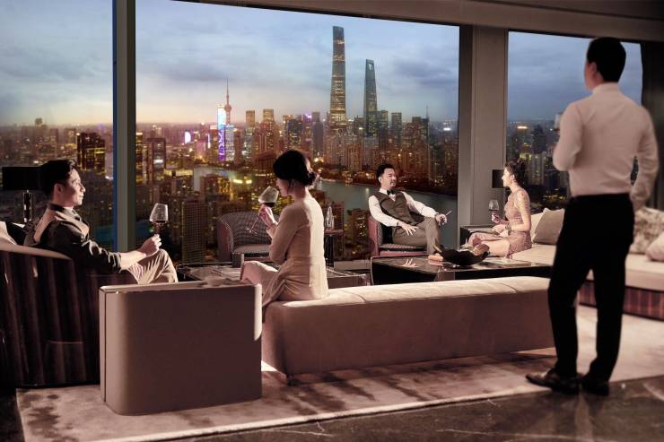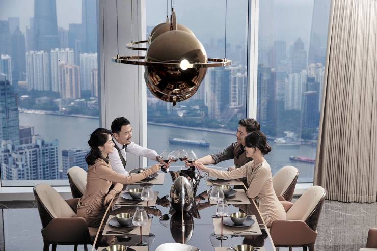 而在这一片璀璨之中,国际奢华级酒店品牌——丽思卡尔顿,以其非凡之姿入驻绿地外滩中心T1#的云端之上,300米超高层的46至62层,成为了其荣耀的栖身之所。这里,274间客房静待尊贵宾客,约10米挑高的奢华大堂,仿佛一扇通往梦幻世界的门户;约1000平方米的宴会厅,宽敞而辉煌,是举办盛宴的理想之地;而高达约8米的奢阔层高,以及外滩之巅的无边泳池,更是将奢华体验推向了极致。