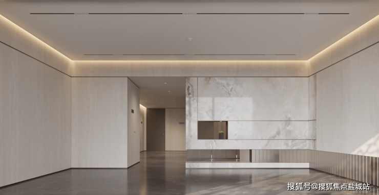 公区大堂选用细腻柔润的云石效果大板背景墙呼应项目现代中式意境,点缀金属造型更显精致,配置酒店式入户门牌凸显归家仪式感。首层及地下大堂墙身采用1200*2400的仿洞石岩板,使得空间更加简洁高级,搭配仿木质材料造型,细节上为业主带来家的温度,集合发光标识及地面标识系统,提升小区品质。