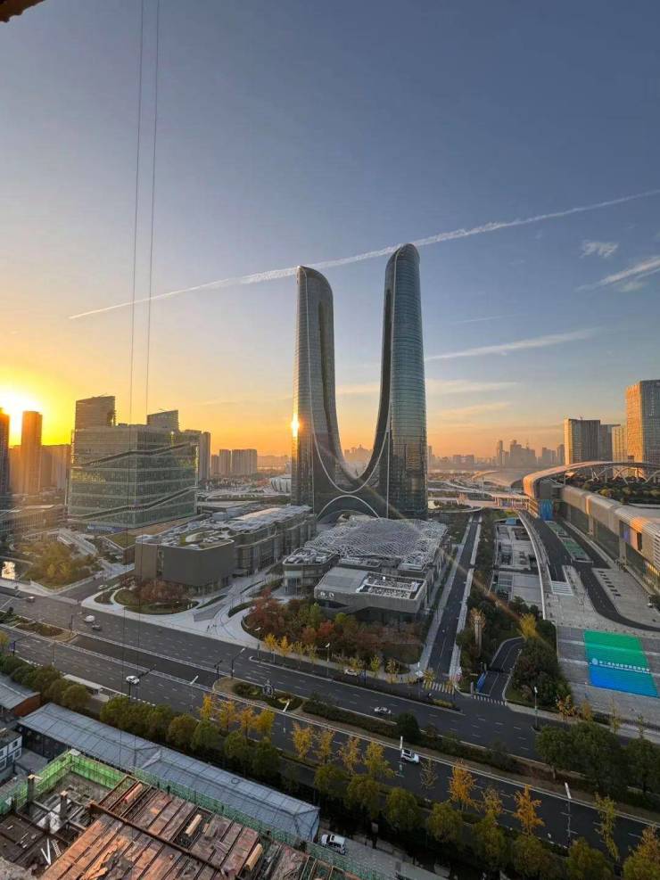项目地处奥体博览城核心位置,簇拥着2023年杭州亚运会建筑群奥体中心、杭州世纪中心“杭州之门”。建筑蕴含着城市丰富的历史文化,并且映射了这里辉煌的城市景观。光滑的玻璃外墙如丝绸般流动飘逸,立体重温着杭州丝绸、杭绣文化,它层层剥落开来,创造出向城市开放的欢迎姿态。