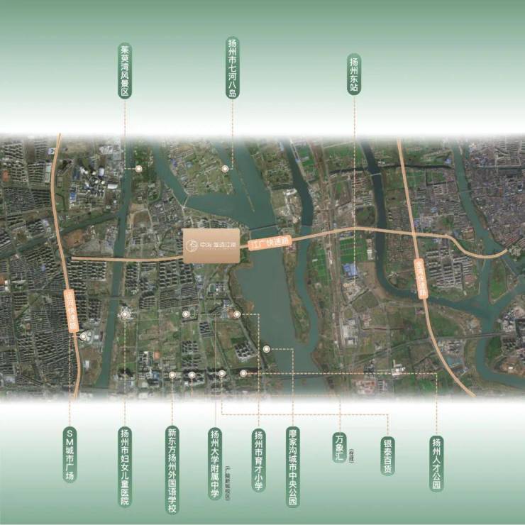茱萸湾风景区、壁虎河生态长廊、廖家沟城市中央公园、扬州凤凰岛风景度假区等环伺左右,共同构成了一片广阔的城市绿洲。