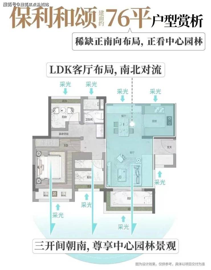 ▪南北对流 ,三开间朝南望中心花园,1+X客厅设计,客厅开间约3.8米