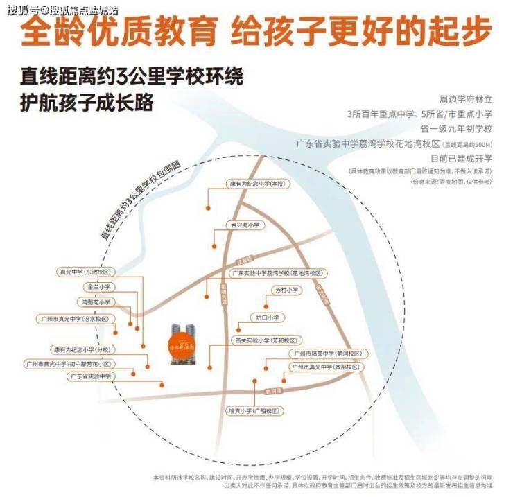 项目自身配建了一所9班幼儿园,距离花地湾省实学校直线距离500米,周边还有真光中学、康有为小学、培英中学等名校