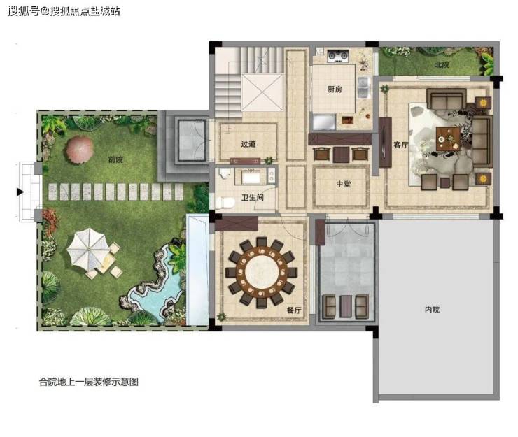 合院一层奢享三重院落,与餐客厅贯穿,形成惬意生活的动线,未来业主可以合理利用将此地打造成户外棋牌空间、茶室等皆可,于此从容接待众多亲朋好友。