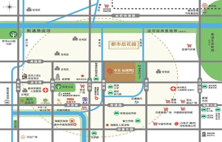 周边规划建有多重自然景观配套,新通扬运河、五里河、老东河三湾环绕,还有规划建设中的泰湖生态新城和罗浮山森林公园,生态环境可圈可点。