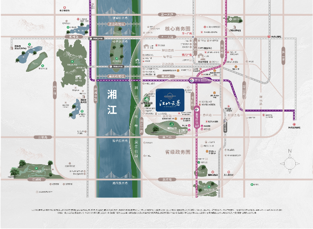 景观资源:项目东临湘江,部分楼栋可直面江景,西侧规划约1.2万㎡中央园林,以“山水画卷”为灵感,打造金属景框屏风、水滴状碧石水景、层叠绿植等景观节点,实现“推窗见江、下楼入园”的沉浸式体验。