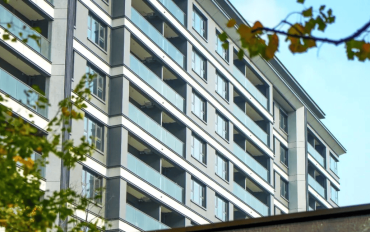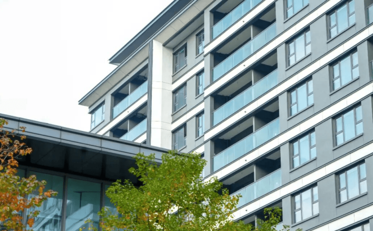 从这里抬眼,透过乌桕斑斓的树叶,就能看到光泽感满满的外立面,采用现代典雅的设计风格,大窗墙比设计。