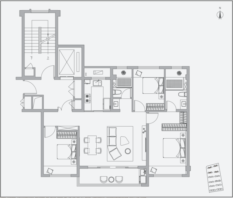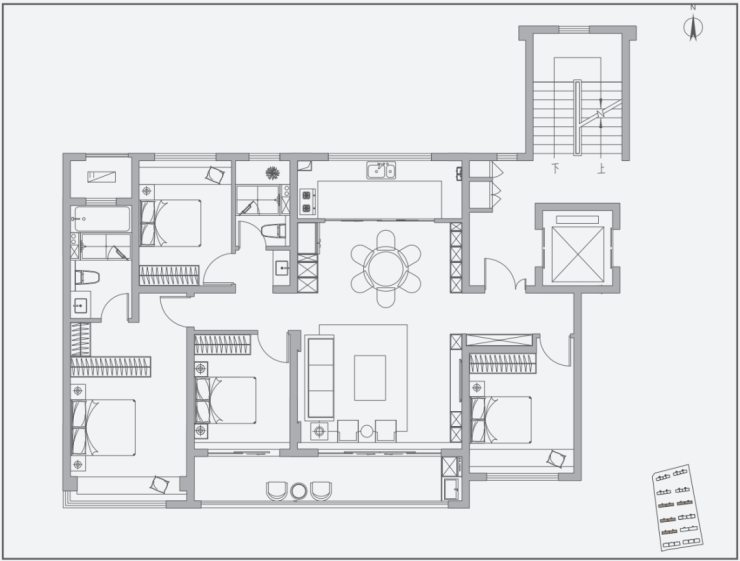 ▼洋房建面约125㎡(四室两厅两卫):四叶草户型,每个卧室私密性都较好,带有南向双阳台,还有一个独立储藏室,对于三代同堂的家庭来说,精致又实用。