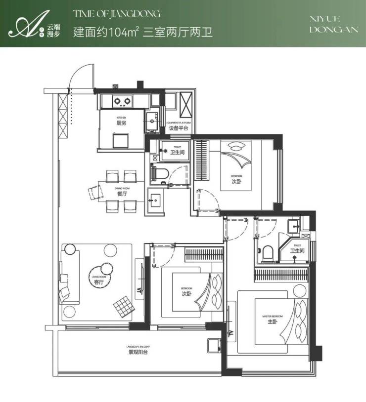 104㎡三房:刚需入场券,3.1 m层高、90 %得房率,南北通透。