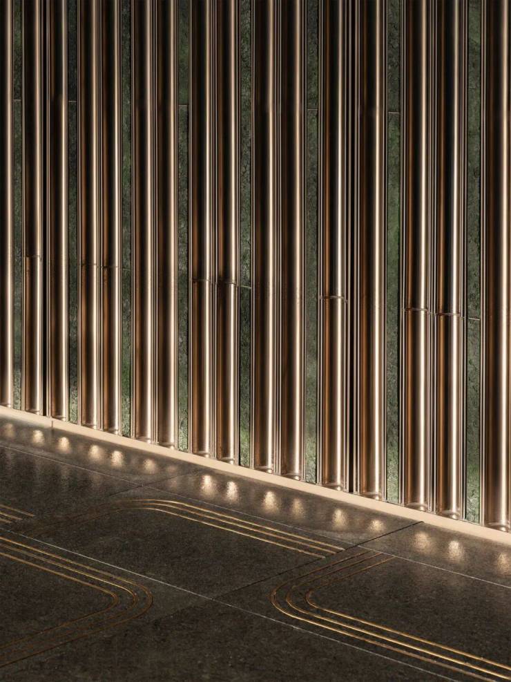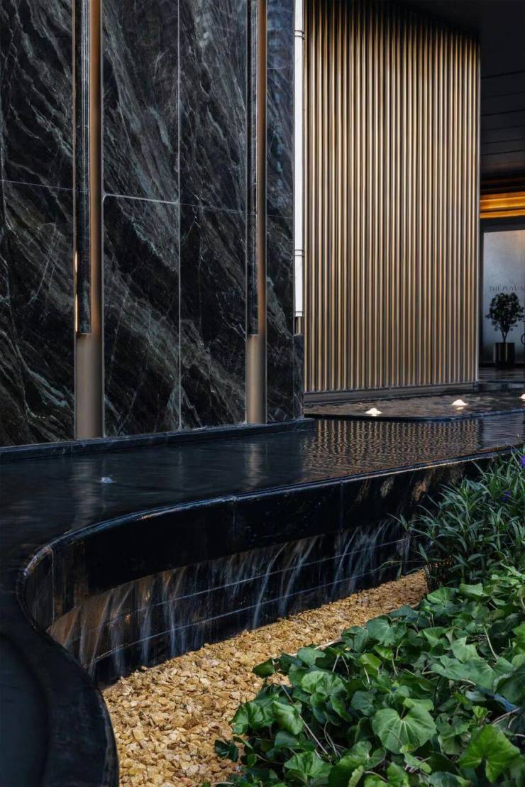 门庭前约29m对称式迎宾水轴,约7m直径落客水盘,水盘底部为“五绝”之巴西银河金奢石[流金银河],以水刀一圈圈切割行纹,形成层层叠水效果,呈现出“金石为开”的视觉奇观。