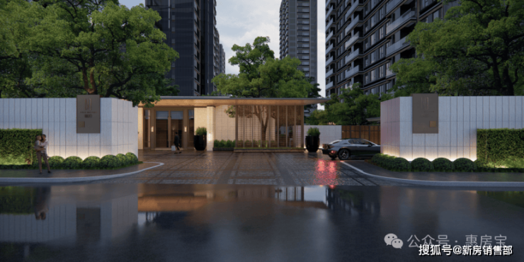 而入口的仪式庭院作为整个社区的第一视角界面,开发商以对称精致的logo高墙形成夹道的礼仪大门,将繁华喧嚣的城市界面与私享的归家区域划分开来。