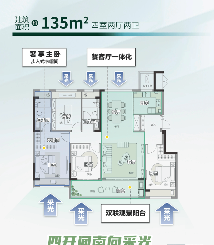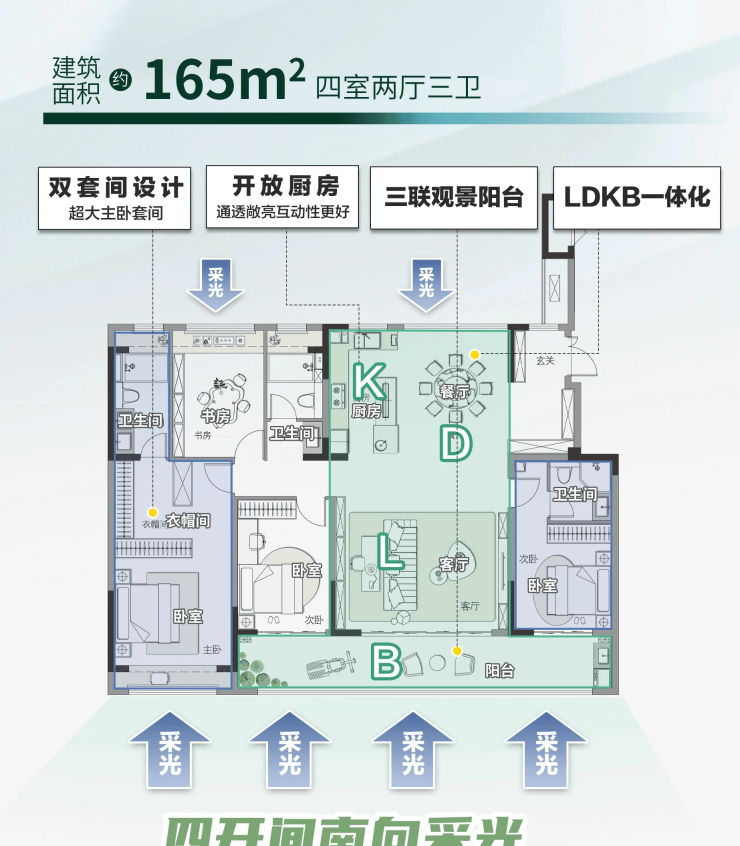 ▼悦园建面约165㎡(四室两厅三卫):全明电梯厅,约15.5米四开间南向面宽,超大三联阳台,约5.5米大宽厅,南向双套间设计,这个户型也是天璟融园悦园爆款中的爆款。