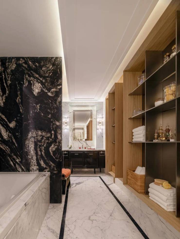 步入式衣帽间隐于卫浴内部,创造出一体化体验,金属质感的柜体材质,与卫浴石材形成对比,增加了视觉的丰富性。