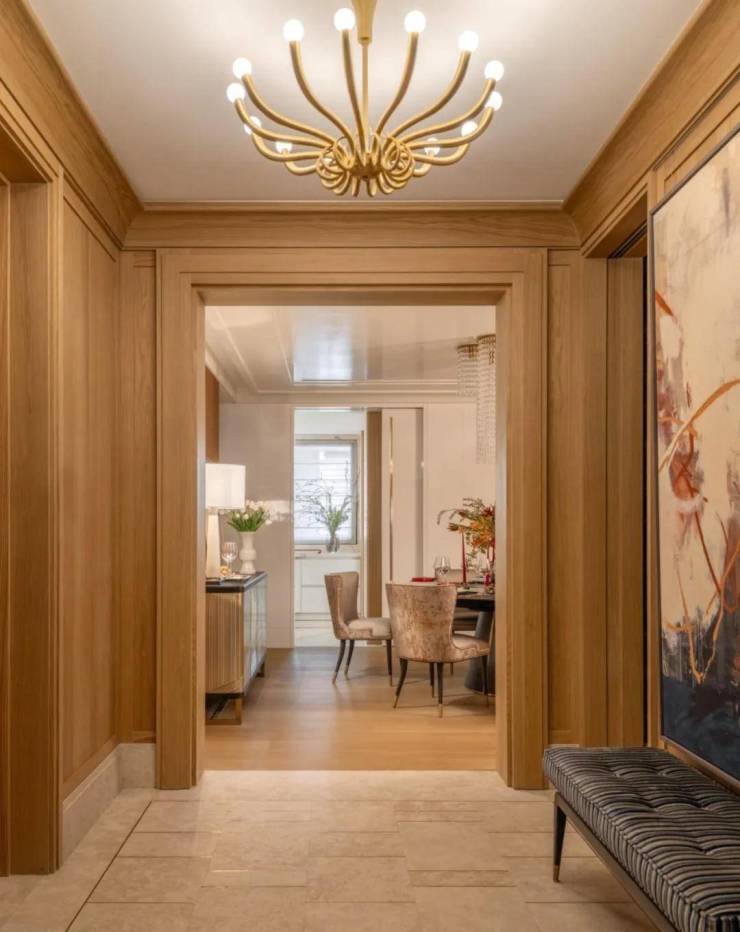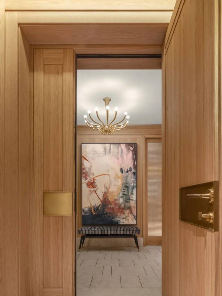 硬装上以木饰面和米色石材做结合,物料原始肌理感,表达经历时间后的沧桑痕迹。大理石地面镶嵌精致金属条,保留材质的原始感,木饰面配柔和灯光,调和出安宁澄澈的归家氛围。