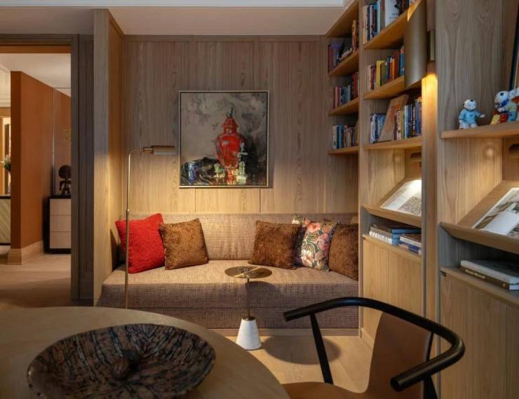 书房色调沉稳大气,精心设计的柔和灯光突显书香气韵,吸引人们长久驻足,于宁静的氛围中品味知识的力量。