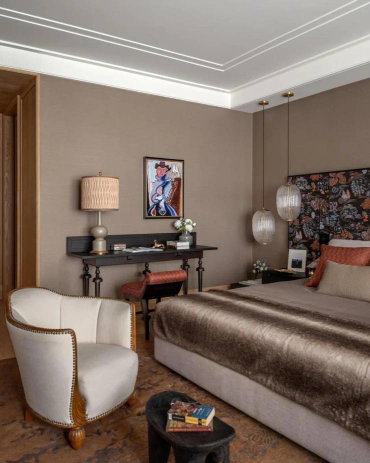 设计师于此放置了一张来自20世纪30年代的Art Deco 扶手椅,并通过法国品牌Métaphores的提花面料,重构椅面的色彩与质感,顺应着上海滩的复古风潮,让古典家具以崭新的容貌重回生活。