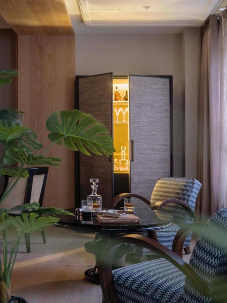 客厅另一端,是连接房内与外景的介质空间,在这里主人和客人可以享受美酒雪茄。看似独立的空间,实际延伸了客厅的功能,也延伸了窗外景观到室内的视线。