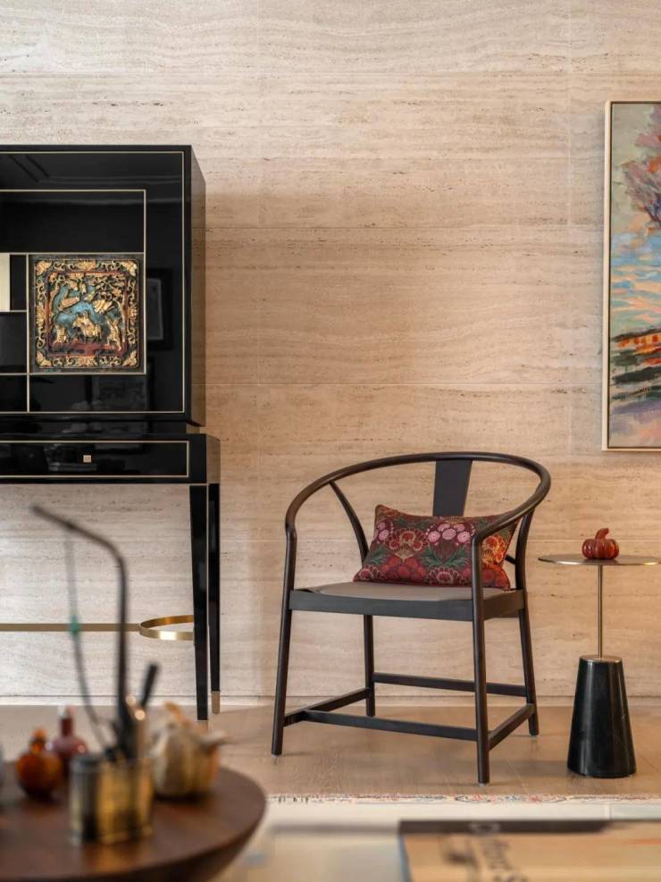 融合焕新的高柜摆放于洞石墙前,哑光与纹路丰富的米白洞石衬托出了高光黑色烤漆的深邃与沉静。而嵌入柜面的中式楠木挂屏无疑是点睛之笔,采用朱红鎏金工艺对人物和图案进行着色,展现了传统与现代完美融合的可能性。