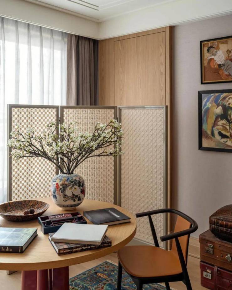 多功能书架彰显着设计的巧思,形成有如博物馆般的展示方式,即可放置日常读物,亦可展示珍本藏书。同时,利用屏风做隔断,与圆桌结合形成私密空间。
