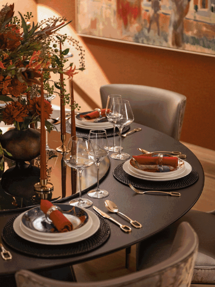 餐桌上盛放的热带花卉与橘色亚麻帆布面壁纸,一同传递出热烈的情感,一幅展现自然风光的画作《The Old Walnut Tree B》丰富了空间的色调,在贵雅的氛围中妆点质朴与原始的美。