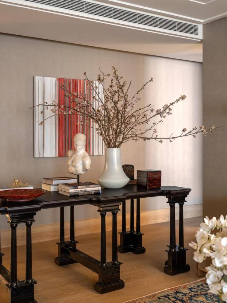主要位置的多功能大长桌,可以做书桌,聚餐冷餐摆台,也可以做艺术品展示桌,让艺术与空间交融相生。同时,大长桌也起到了模糊走廊与客厅空间的作用,无形中放大空间的层次感,增添了空间的功能性。
