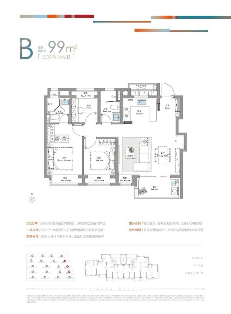 建面约99㎡三房:该户型是典型的飞机格局,很大程度上提高了使用率