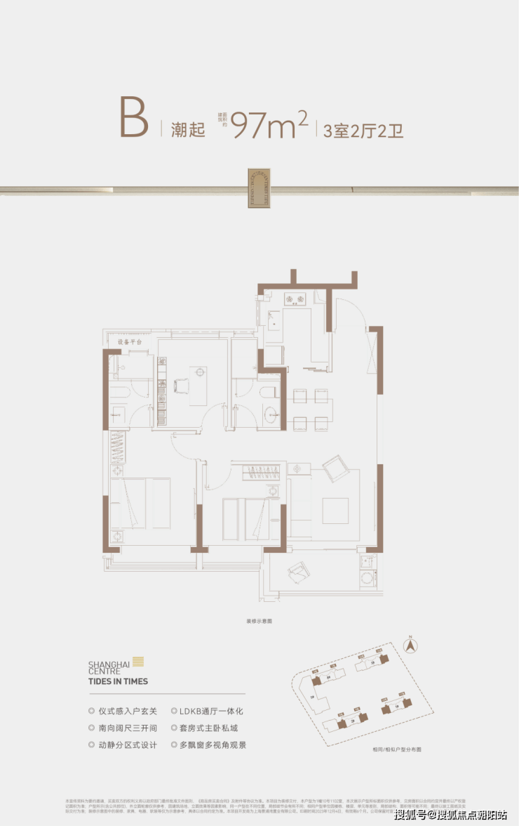 在格局上,户型三开间朝南+动静分离,室内通风、私密性俱佳。