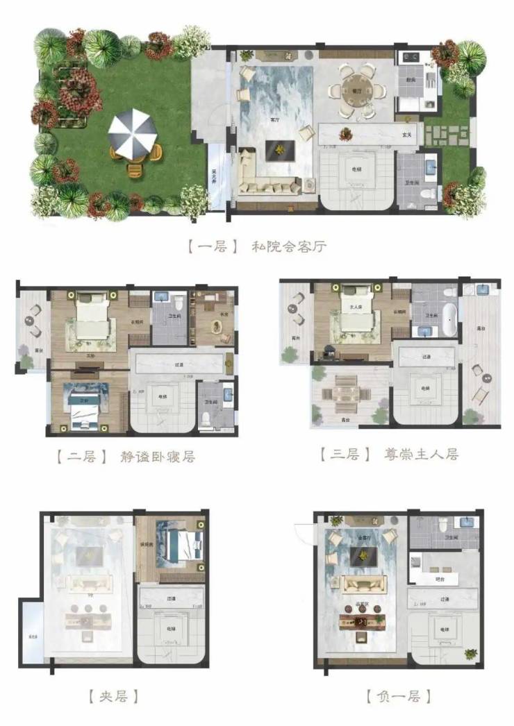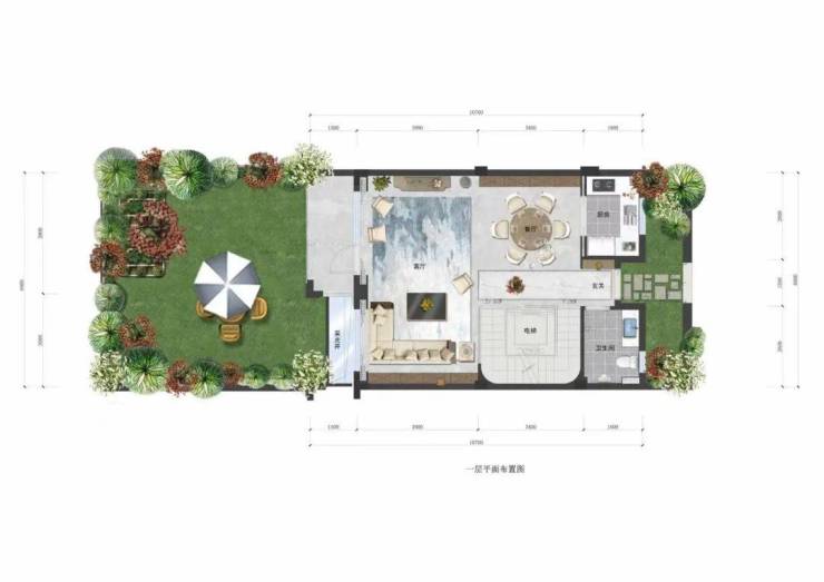 一层:私院会客厅● 独立景观餐厨空间,全开间、私家院景客厅,尊显大户风范● 左右双重私家院落,畅享大片绿色自由天地,细微处涵养情调生活!