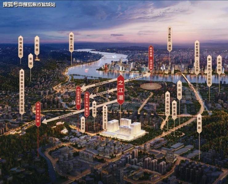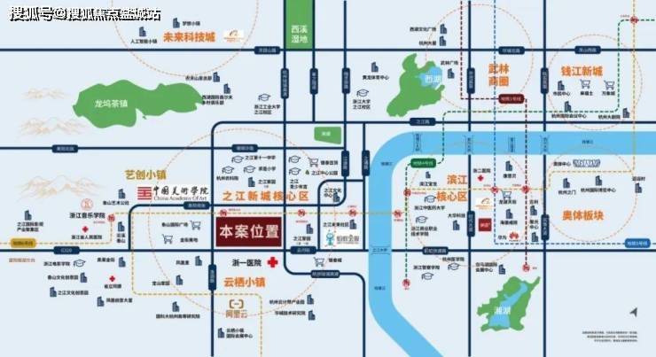 项目坐落于杭州市西湖区之江新城核心板块,毗邻富阳银湖开发区,紧邻杭州绕城高速西线转塘枢纽。地块北侧与中国美术学院、浙江音乐学院等高等艺术学府接壤,所处区域为政府重点规划的国家级文旅发展示范区,兼具钱塘江景观资源与西湖风景名胜区双重生态优势。