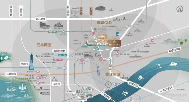翻开地图,你会发现,璞云东方与城市核心板块紧密相连,沿着机场路一脉直达武林,走同协路直抵钱江新城二期,正处“江河汇—武林中心—钱新二期”主城黄金三角的交叠处。