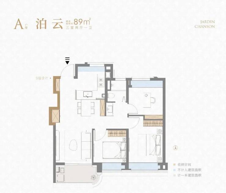 重点我想说说该户型的收纳,大量S墙的设计简直见缝插针,极大的扩容了家的储物角落,消减了业主生活的繁琐。