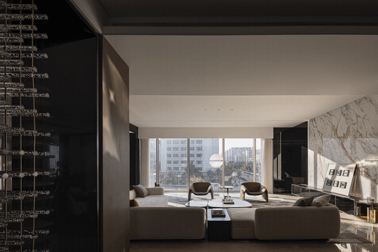 空间在材质搭配上,也是极尽雅奢可能。鱼肚白岩板打造的大岛台,营造温情的社交一隅;木饰面与金属软硬质感的碰撞,有序的墙面分割把握了整体空间的节奏感;双背景墙分别由鱼肚金岩板和劳伦黑金色系展墙组成彰显奢华。