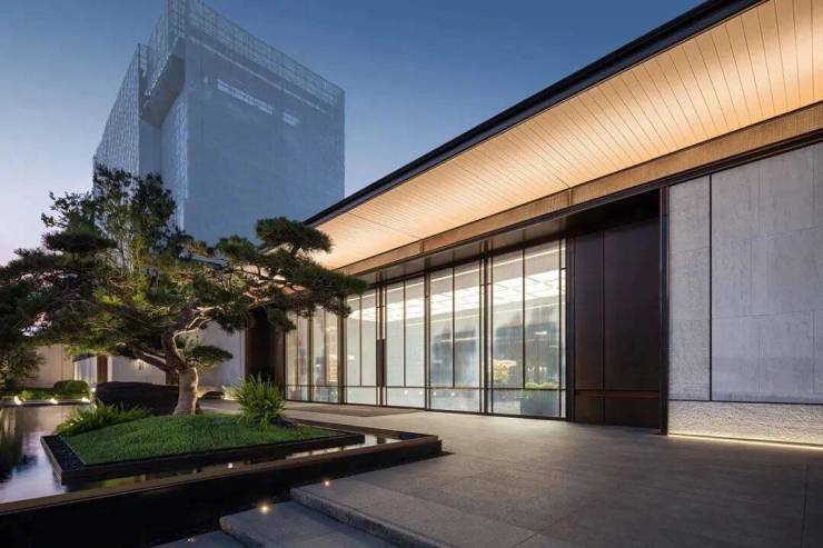建筑门堂的比例恰到好处,呈现出诗意画境。1:5至1:6的高宽比,使建筑既稳重又灵动。入口两侧的景墙与水景相映成趣,勾勒出一条充满诗意的归家之路,体现了江南昆山的东方韵味。