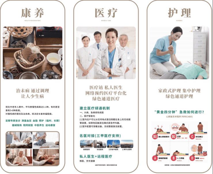 联合专业的医护团队,从医疗、康复、护理三个维度给老年人提供长者建档、互联医生、专家问诊、指标监测、绿色医通、介助介护、康复训练、健康讲座、心理疏导等9项医护内容;