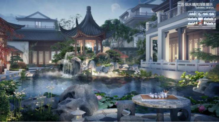 碧水石桥,袅袅林烟。以一池水韵为中心,形成一种向心的、内聚的空间特性。水景即为风水之水,水可化煞“气乘风则散,界水则止”,大利财源。一池水韵通过叠山理水,营造苏式园景,搭配书香亭、风雨连廊等有机互通,形成以小见大的苏式景观,凭栏眺望之时更添身心惬意。