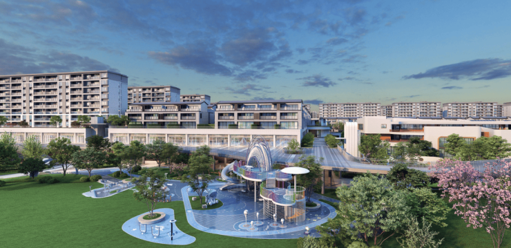整个项目由两宗地块组成,占地约425亩,总建筑面积约48万㎡。是一座涵盖约4.5万㎡公园、幼儿园、九年一贯制学校、文体中心、邻里中心等复合业态的超大“公园城市”。