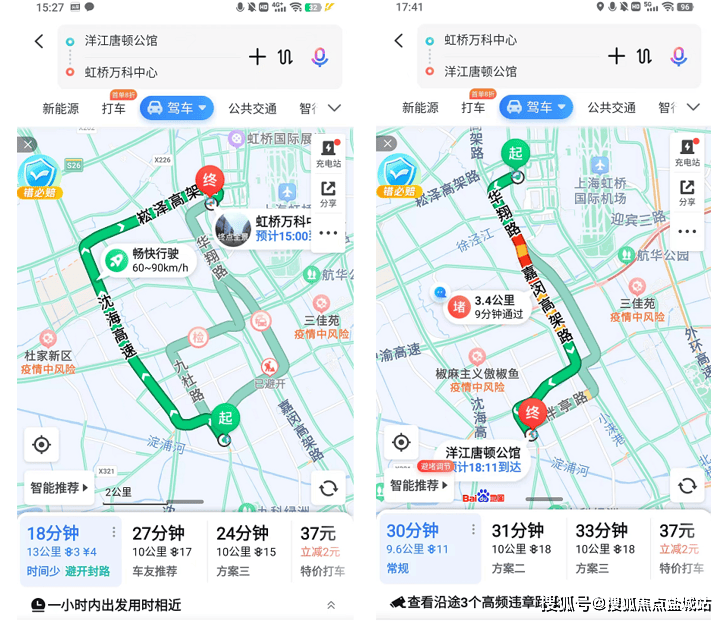 我截了一张不堵车,一张上下班高峰的百度地图导航,供大家参考: