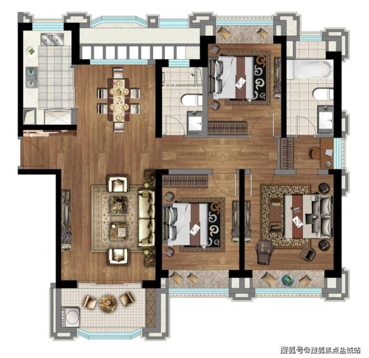 建面约95㎡2房,创新户型,全明设计。在一体化设计的客餐厨阳台中,一家人平时聚在其中,无论是坐在沙发上歇息、在厨房中烹饪、在饭桌上吃饭,窗外的风景都是生活的点缀。
