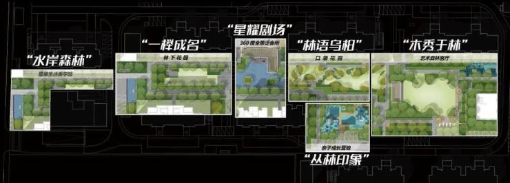 将自然意趣与自然景观融入园中,呈现星光森境的景观。以超长绿廊中轴为依托,缔造“浮森六境”的星翠繁森盛景。