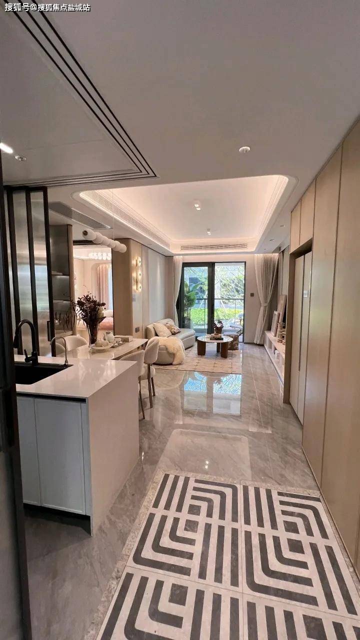 入户大堂,更会感受到一种别样的尊贵体验。顶部仿石材艺术玻璃以其独特的纹理和质感,犒赏着每一位归家的业主。蓝金沙岩板则平添了一份奢华与神秘的美感,让人仿佛置身于一个充满魔力的空间中。而大面积的镜湖春晓岩板,以其淡雅内敛的光泽,带来了一种非同一般的尊贵感。